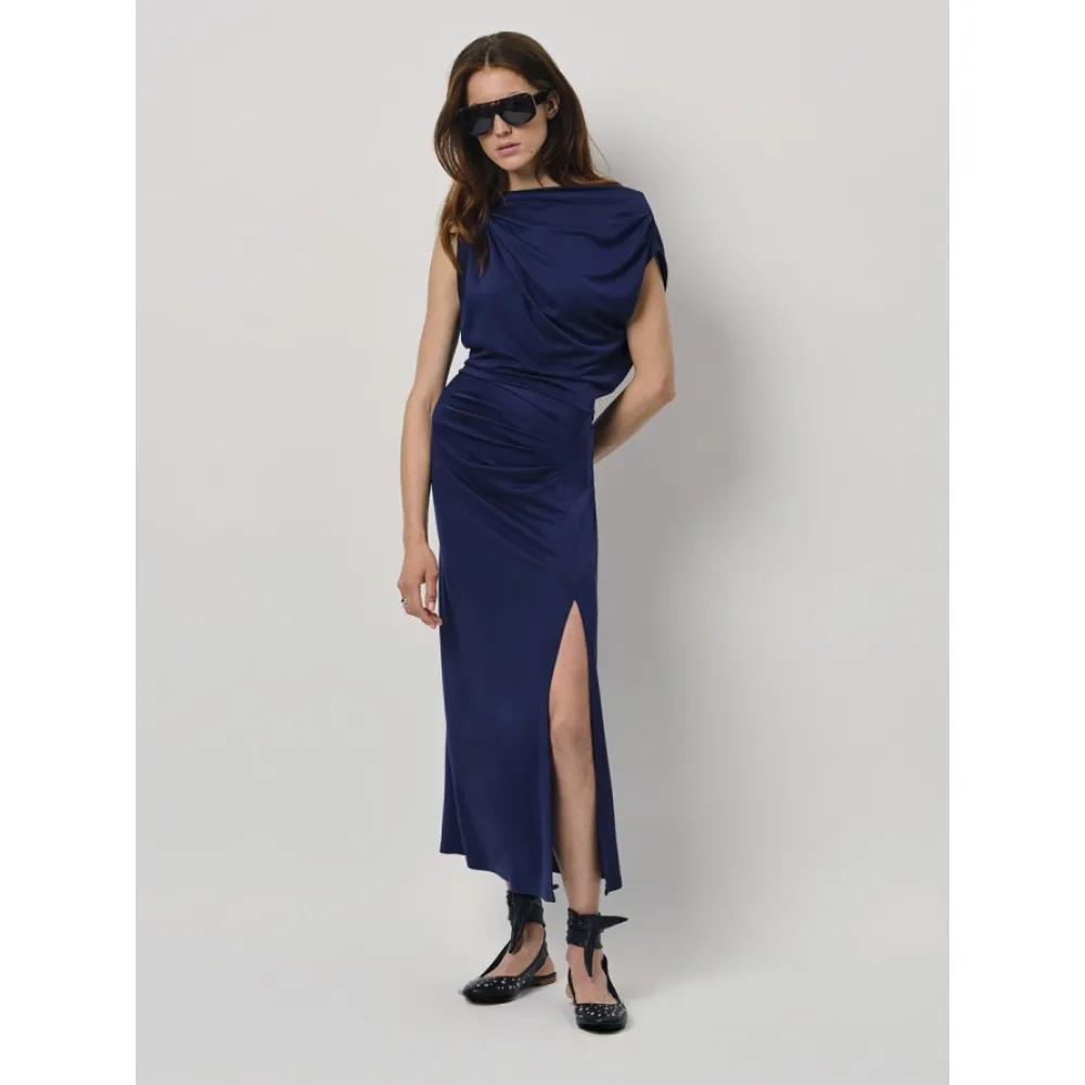 De jurk heeft een diepe split aan de zijkant wat zorgt voor meer raffinement en elegantie. De jurk heeft plooien op de schouder, in de taille en op de rok en heeft een luxueuze look dankzij de mooie sandwashed Lenzing-Modalmix. Draag de jurk no-nonsens met een platte sandaal of ga voor feestelijk met een chique high-heel eronder.