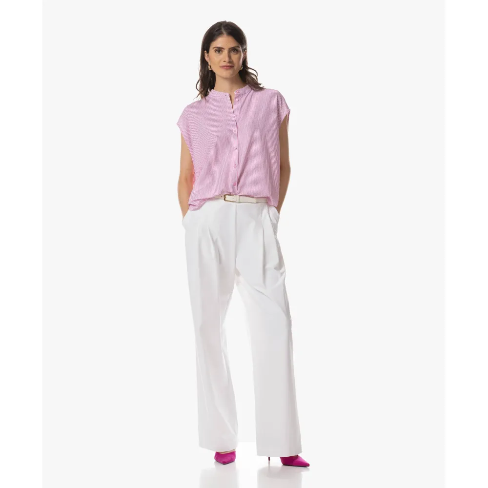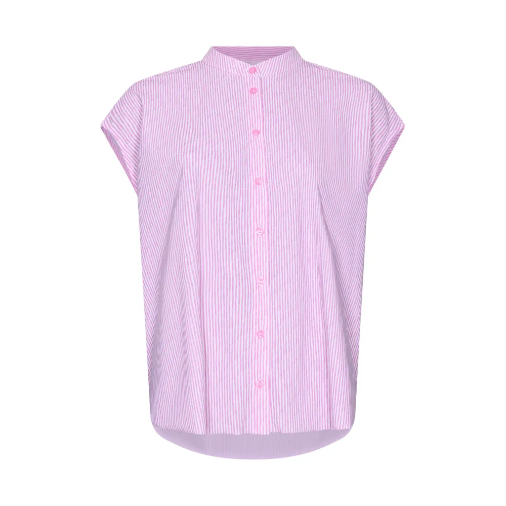 De blouse is verkrijgbaar in Pink Lady Stripe en in Cashmere Blue Stripe.