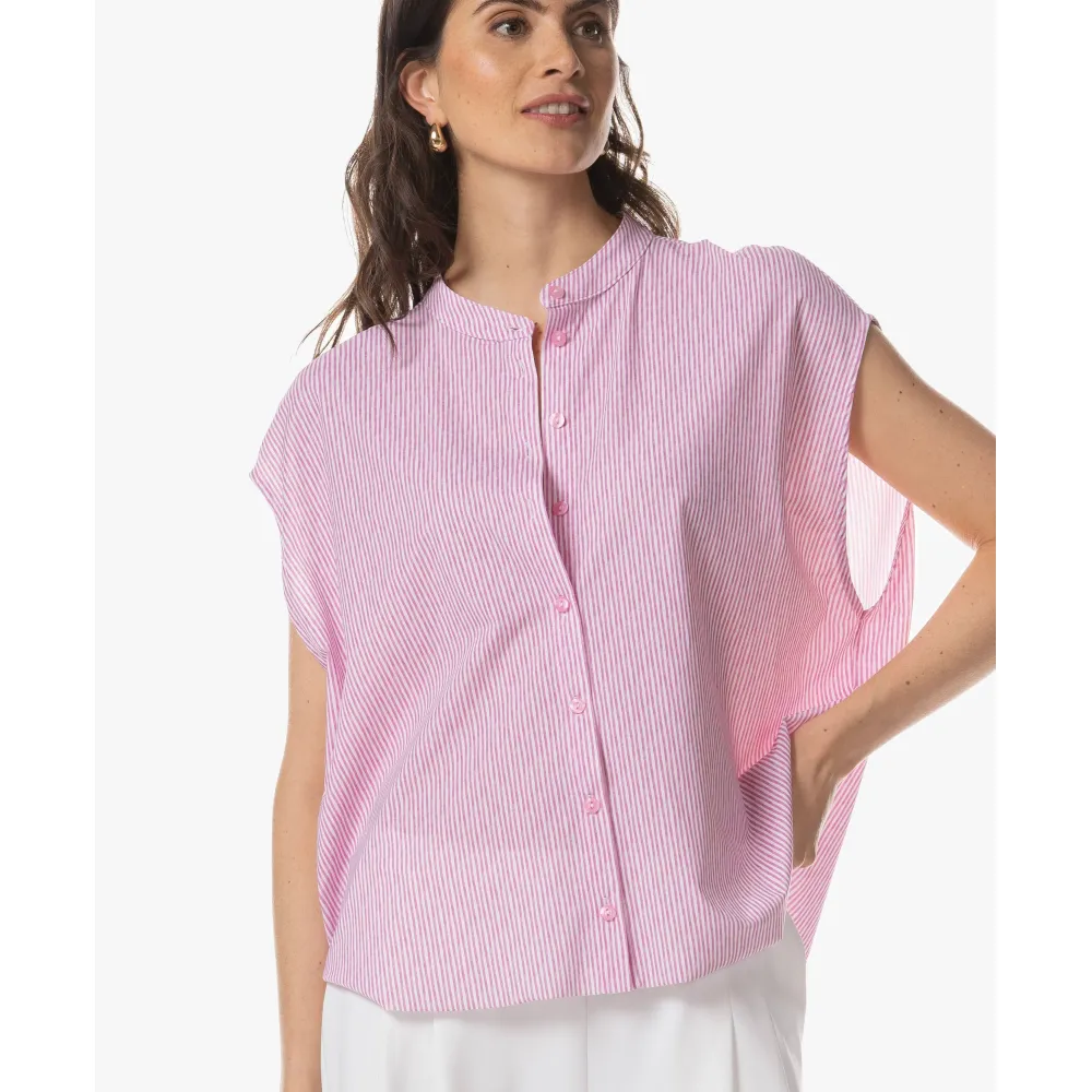 Blouse Tokiko laat zien dat eenvoud juist krachtig kan zijn. Het losvallende, afgeronde silhouet valt soepel om het lichaam en creëert een flatterende, luchtige look. De lichte travel jersey voelt comfortabel en beweegt moeiteloos met je mee. Met de moderne mao-kraag, doorknoopsluiting en frisse streepprint krijgt de blouse een eigentijdse uitstraling. Een veelzijdig item dat je eindeloos kunt combineren.